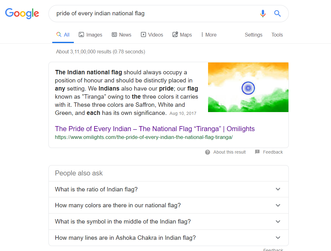 We Indians also have our pride; our flag known as ”Tiranga” owing to the three colors it carries with it. These three colors are Saffron, White and Green, and each has its own significance. These three colors represent inculcating moral values which root deep down in Indian soil.