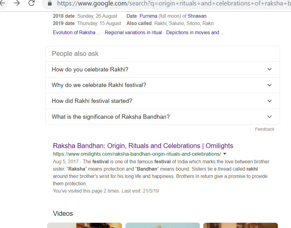 You can check the below link to watch the video.https://www.youtube.com/watch?v=Od3O7ZJ3uyg - Third important keyword on google search is “origin rituals and celebrations of raksha bandhan“.India is a country of rich heritage and varied culture, and boasts about its various festivals that are celebrated round the year which signify its rich heritage and culture.There are many festivals celebrated in India; Raksha Bandhan is the one which celebrates the bond of love between brother and sister. The festival comes in the month of August, and is celebrated all over the world with equal love and pious.