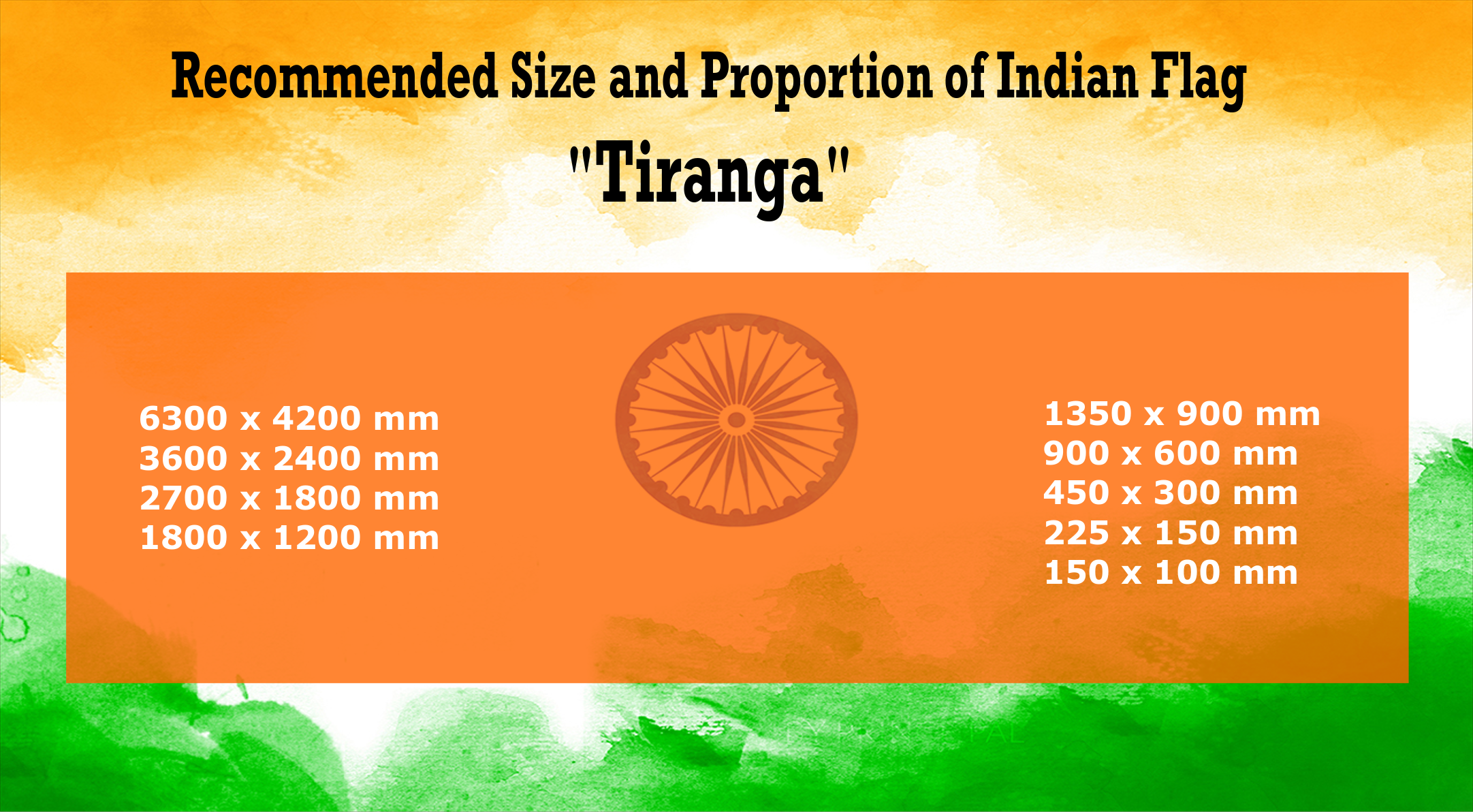 The Indian national flag is of a rectangular shape with precise proportions. The standard sizes of the National Flag, “Tiranga,” are as follows: